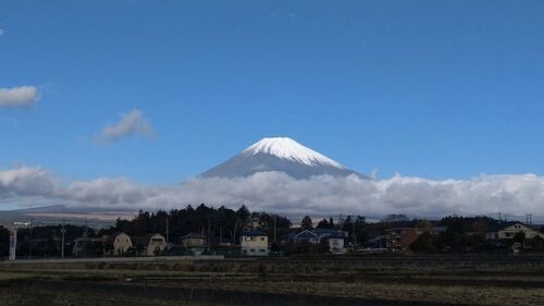 今朝の富士山です。 麓には帯状の曇がかかっていて、雲の上に頭が出ている富士山です。