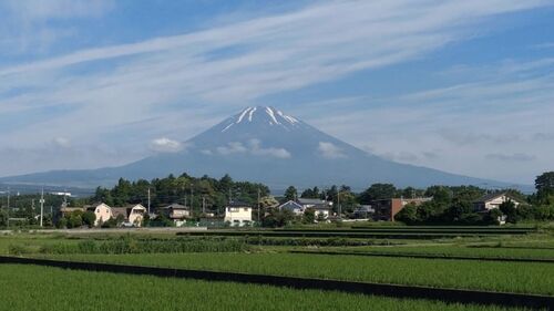 今朝の富士山です。 田んぼの稲は伸び、富士山の雪はだいぶ減ってきました。 梅雨に入ると、なかなか富士山を見ることが出来なくなります。